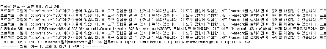 부모글 보이기/감추기 AD BLOCK 해제 요청 이 글에는 광고가 많이 들어가 있지 않습니다. adblock을 해제하셔도 글을 읽는데 그다지 부담이 없으니 해제를 부탁드립니다. 첨부한 사진처럼 이와같은 에러가 납니다... 2012에서 작성한 코드를 2010에서 빌드하니까 이러한 문구들이 나오는데 어떻게 수정을 해야할지를 모르겠습니다..ㅠㅠ [다음 글] C# 해상도에 따른 자동 사이즈 조절방법이 궁금합니다.[이전 글] vs2013에서 빌드한 com 컨트롤 객체를 닷넷 2.0에서 사용하려 합니다 [최초 등록일: 12/15/2017] [최종 수정일: 12/15/2017] 비밀번호 댓글 작성자 2017-12-15 07시45분 .csproj 파일을 열면 Project 노드에 ToolsVersion 속성 값이 12.0으로 되어 있을 것입니다. Visual Studio 2010에서 프로젝트를 만들면 그 속성 값이 다른 값으로 되어 있을텐데 그 값으로 교체해 주면 (아마) 컴파일이 잘 될 것입니다.원래 하위호환성은 가능해도 그 역은 어렵습니다. 정성태 1 2 3 4 5 6 7 8 9 10 11 12 13 14 [15] ... NoWriterDateCnt.TitleFile(s) 5605강성봉2/10/202215014TCP PSH flag 패킷 수신 에러 [1]5604LW2/9/202216228VISUAL STUDIO 2019 ==> 2020 설치시 오류가 생겨서 문의드립니다. [3]5603김진명2/9/202216807C# 10.0 출간은 언제쯤 계획하고 계신가요? [1]5602신갑영2/8/202215757윈폼에 대해서 질문 드립니다. [1]5601김인태2/4/202215275setup project 관련 [7]5600itkim2/3/202218694윈도우 서버 계정 패스워드 인증 문의 [5]5599레드골드2/3/202220147c#으로 ms word 제어 가능할까요? [6]5598jaew...2/2/202215962Dictionary는 참조형식인가요?? [1]5597재원2/2/202216639c# 9.0에 대한 내용을 받을 수 있나요? [1]5596kss1/26/202215844듀얼 모니터 환경에서 wpf 프로그램 크기 변경 [2]5594mira...1/25/202214713안녕하세요 try~catch 와 SuspendLayout~ResumeLayout 간 호출 문의드립니다! [2]5593C#스터디1/12/202218134TaskAwaiter 구현 질문 입니다. [1]5591유지킴12/24/202115717outofmemory in 32bit [2]15590kss12/23/202115123포인터 메모리 에러 [1]5589초급12/22/202114583c# -> 라즈베리파이(db 접속)시 에러 발생 [7]5588김지신12/21/202115802안녕하세요 String 변수 참조 주소 질문입니다. [2]5587이완호12/17/202118350C# SharpDX 화면 캡쳐 관련해서 질문 드립니다. [1]5586조미김12/16/202116172윈폼에서 메인 스레드와 UI 스레드의 차이점 질문드립니다 [4]5585김준희12/16/202117002C# 윈폼 TCP/IP 데이터 연속으로 보낼때 [1]5583난인간이다12/10/202114776.net 6 dynamic pgo 활성화 및 예상되는 문제 [1]5582김준희12/9/202125856C# TCP/IP 통신시 연결 끊김 에러 [1]5581김시준12/9/202117208닷넷에서 파일 delete 함수는 왜 비동기가 없는 것인가요? [2]5580카짜프로...12/7/202118727패턴매칭 -튜퓰비교에 관한 오류사항과 궁금증 [1]15579카짜프로...12/6/20211688511.12 메서드 중복정의에 대한 질문 [1]5577감사합니...11/30/202117096visual studio 2015 update 3를 다운받을려고 하는데 x64/x86 차이점이 뭘까요? [2]5576노홍구11/29/202117073C# 으로 USB 스캐너 프린터 리셋하기 입니다. [1] 1 2 3 4 5 6 7 8 9 10 11 12 13 14 [15] ...