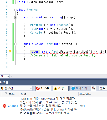 부모글 보이기/감추기 AD BLOCK 해제 요청 이 글에는 광고가 많이 들어가 있지 않습니다. adblock을 해제하셔도 글을 읽는데 그다지 부담이 없으니 해제를 부탁드립니다. 비동기관련 간단한예제를 실행하면서 이해하고자 합니다. 캡처파일은 검색으로 발견한 예제입니다. 에러가난 이유를보면 GetAwaiter에대한 정의를 하라고 하는것같은데요.. 검색시 발견한예제들은 async , await , StartNew구현시 GetAwaiter없이 잘되는거같습니다. 저 에러가 나는건 어떤이유일까요...ㅜㅜ [다음 글] 비동기 TCP통신 데이터 문제[이전 글] [삭제] 스레드 안에서 Window Visibility 변경시 DialogResult 오류 질문 [최초 등록일: 1/26/2018] [최종 수정일: 1/26/2018] 비밀번호 댓글 작성자 2018-01-29 01시24분 프로젝트 설정의 "Target framework"을 4.5 이상으로 하세요. 정성태 ... 31 32 [33] 34 35 36 37 38 39 40 41 42 43 44 45 ... NoWriterDateCnt.TitleFile(s) 5084김광흠11/9/201821028사운드 파일 "filename.wav" 와 같은 특정 파일이 실행되는것을 감시하고 싶습니다. [3]5083거북이11/4/201822578타입의 범위를 넘어서는 연산의 개념을 모르겠습니다. [4]5082꾸엉11/1/201818482BCL 타입을 모아둔 곳이 있나요? [2]5081꾸엉10/31/201818716C# 7.1 235p 질문입니다. [3]5080WPF초보10/30/201821439[WPF] IsManipulationEnabled속성 설정시 Click이벤트 문의 [1]5079jhp10/30/201821635이 소스에 API후킹 소스를 추가하고 싶은데 어떻게 해야될지 모르겠어요. [4]5078꾸엉10/29/201819126C# 7.1 185~187p 질문입니다. [2]5077윤현수10/29/201826585setup파일 설치 이후 실행이 안되는 현상 [11]5074진우10/28/201818792C# 생성과 동시에 초기화 하는 코드 문의 [2]5073돌고래10/27/201818805c# 공부 방향 질문 드립니다. [3]5072엔벌잉10/24/201817871C# textbox, button질문입니다! [4]15071엔벌잉10/23/201819584C#윈도우폼 질문입니다!! [2]5070진우10/17/201819800Visual Studio 서비스팩과 업데이트 차이 문의 [2]5069감자10/12/201820425빌드 구성을 재설정하는 방법이 있을까요? [1]15068누오10/10/201819032ASP Core 2.0 에서 dll안에 있는 뷰 읽어들이는 방법? [1]5067김정민10/5/201820120다른 윈도우가 깨지는 현상을 막을 수 있을까요 [3]5066로니브10/4/201820552ASP.NET MVC에서 View 파일 숨기는법? 보안처리 하는법? 관련 질문.. [1]5065키모10/1/201822469문자 질문입니다. [3]5064로니브10/1/201821668클래스 라이브러리에서 .cshtml파일을 추가하는 방법은 없나요? [3]5063진우9/28/201819993ADO.net 과 Entity Framework 차이 문의 [2]5062테스트9/27/201820814C# import file 의 구조체 배열 선언 및 호출에 대해 문의. [3]5061안녕하세요9/13/201821591c# 프로그래밍 관련 문의 [1]5060임민재9/8/201820575c# install 파일 생성 시 문제가 발생하였습니다 [1]15059김9/7/201820207Winform TextBox 포커스 유지하는 방법 질문 [파일첨부] [1]15058김9/5/201825129Winform TextBox 포커스 유지하는 방법 질문 [3]5056박종윤8/30/201824106c# dll을 C++에서 사용 시 event 호출 [4]1 ... 31 32 [33] 34 35 36 37 38 39 40 41 42 43 44 45 ...