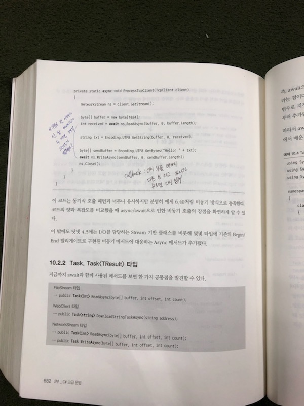 가장 이해가 안 되는 부분인데 p682쪽에 ns.ReadAsync가 끝나 야 그 밑에 코드가 실행되는데 굳이 await ns.WriteAsync를 사용할 이유가 있나요? 즉, 메서드 내에서 await를 쓰면 그 전 명령어는 호출 스레드에서 실행되다가 await구문 이후로는 호출 스레드는 반납되고 정성태님이 말씀하신 스레드풀의 스레드나 Task나 같은 별도의 스레드로 그 후 명령이 실행되고 그 이후는 순차적으로 실행될 텐데 말이죠.. (await 이후에 스레드 풀 스레드가 반납되는 게 아니라 메서드 종료 후에 원래 스레드 흐름으로 복귀하는 거로 저는 알고 있습니다)이렇게 생각한 이유는 p677 예문에 주석으로 await이후의 코드는 c# 컴파일러가 분리해 ReadAsync 비동기 호출이 완료된 후 호출이라고 쓰여 있어서요... 정리하자면 ns.ReadAsync가 종료되고 그 이후의 명령이 순차적으로 실행되고, 다시 ns.ReadAsync가 종료되고 ns.Close()가 실행되는데 첫 번째 await는 호출 스레드 제어를 반납하기 위해서(첫 번째는 별도의 스레드에서 작업하기 위해서)  그럴 수 있지만 두 번째 await는 의미 없는 거 아닌가? 가 제 궁금증입니다...