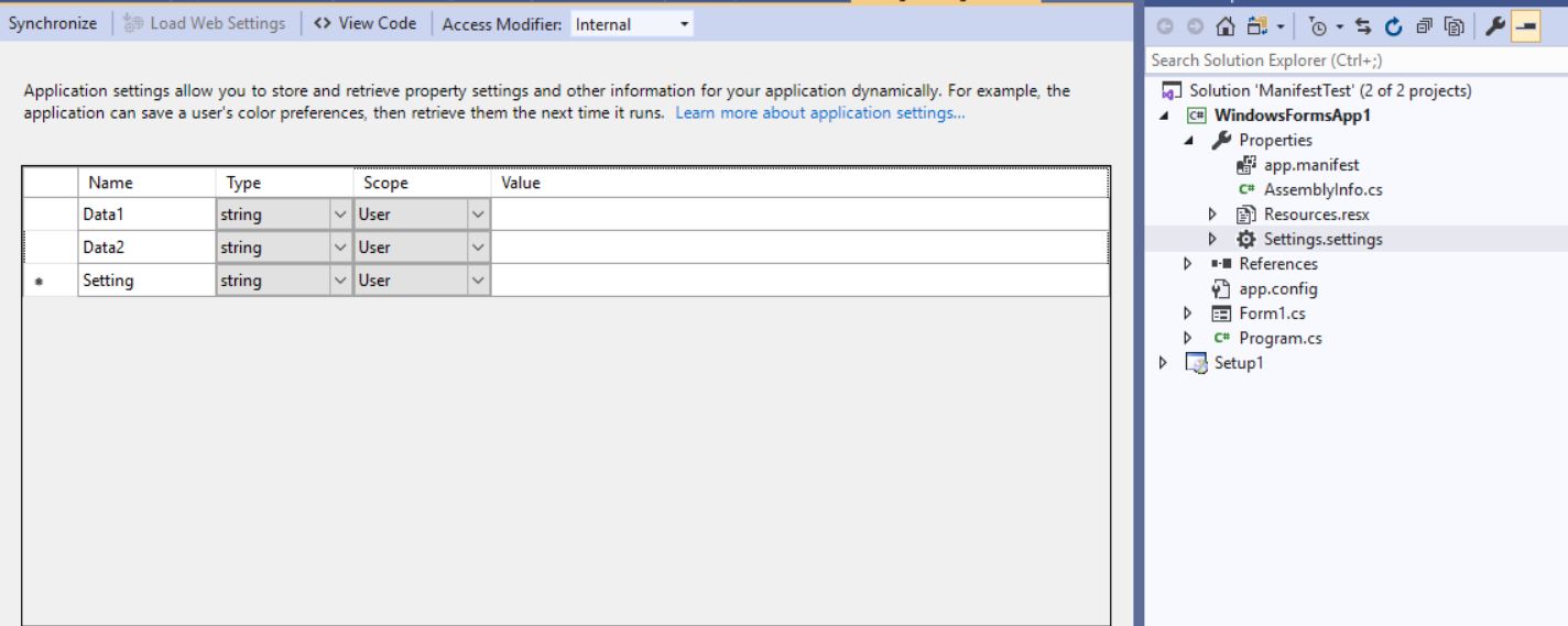 첨부된파일처럼 c#에서 Settings에서 변수를 Data1,Data2라는 변수를 만들었습니다.