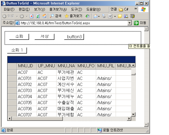 버튼1을 클릭시에 데이타가 그리드에 잘 올라옵니다.
