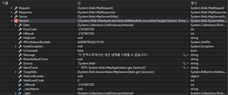 디버깅 시에 HttpContext를 꺼내기 이전 세션에 담긴 값은