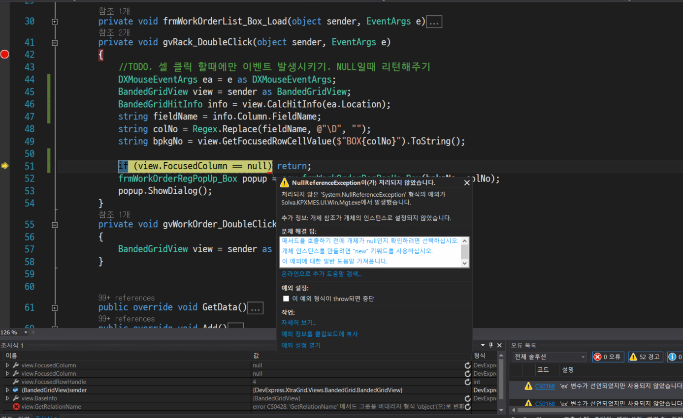 그나저나, 화면에서는 view가 null이어서 참조 오류가 발생하는 것 같은데, 그렇다면 if 문을 넣은 경우 "아예 이벤트 발생이 되지" 않는 것이 아니라 언제나 오류가 발생할 텐데요. 원하는 기능으로 동작하는 것에 상관없이 해당 코드는 if (view != null && view.FocusedColumn == null)과 같은 식으로 작성해야 합니다.